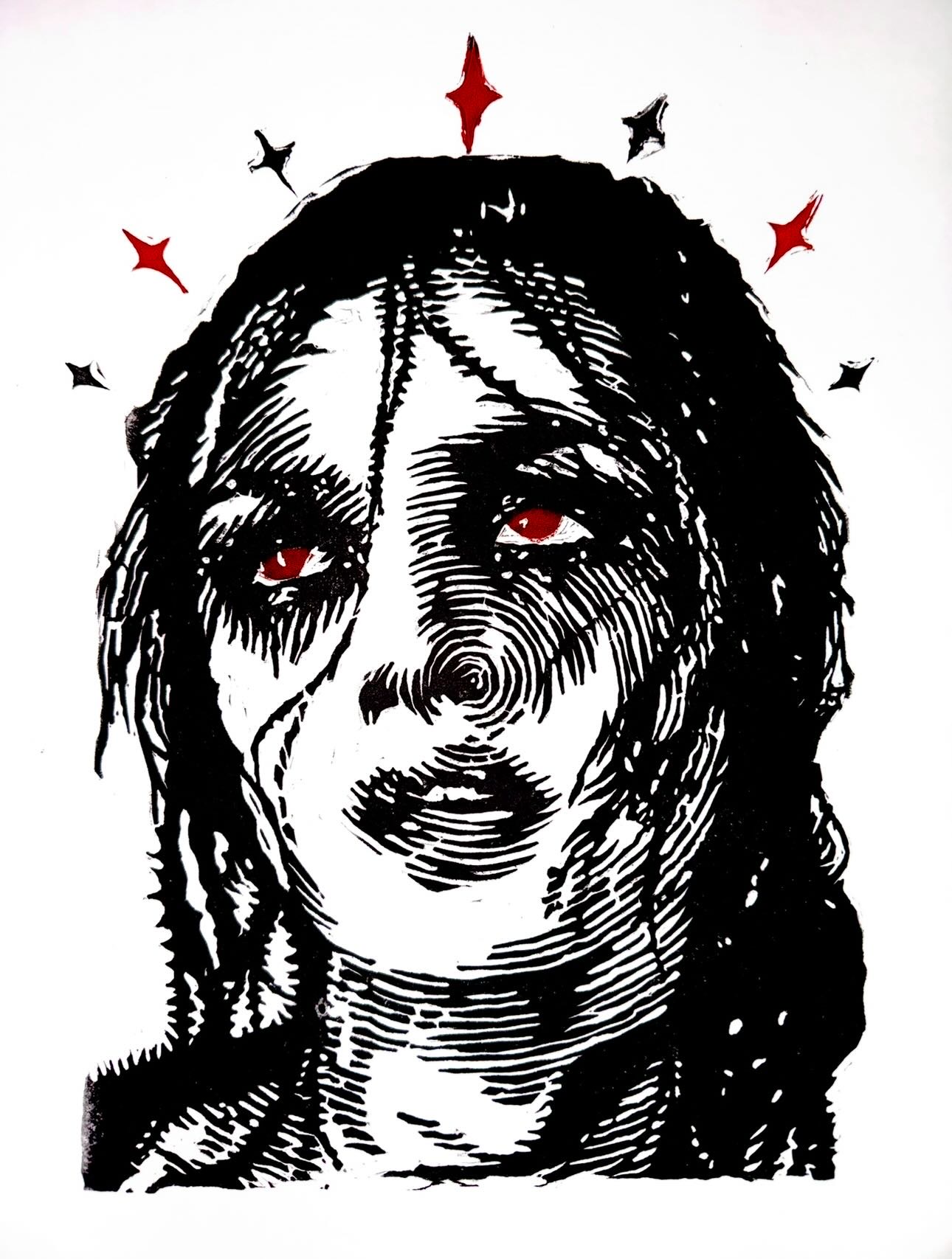 Jory is no stranger to Brushfire. The artist-extrordinare has three pieces in our last edition (Edition 77, Volume 2) alone– Vanquished, Hunter, and the aforementioned Hypnosis. Vanquished plays with shadows and contours, using only black, red, and white. Hunter shows the outlines of a man in darkness, highlighting parts of his face while downplaying others. Jory pulls from the deep well of human emotion with only a few hex codes.